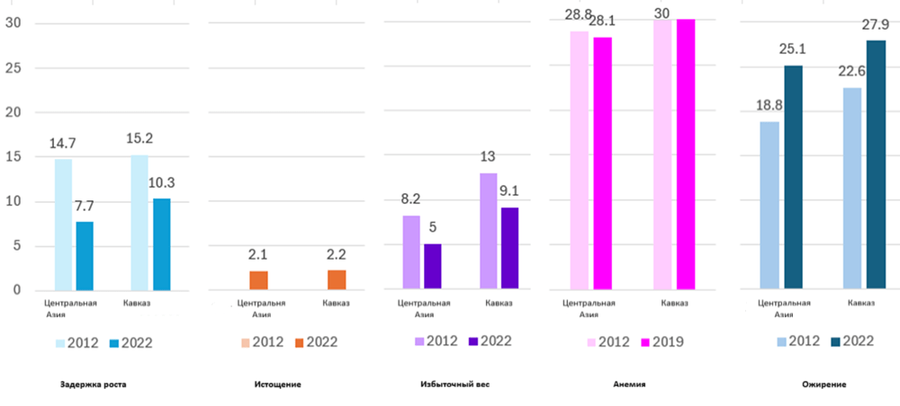 Региональные и глобальные тенденции также указывают на рост проблем анемии и избыточного веса у детей в странах Центральной Азии, несмотря на снижение показателей задержки роста. На основе доклада «Состояние продовольственной безопасности и питания в Европе и Центральной Азии 2024», можно делать вывод о том то в Центральной Азии и на Кавказе достигнут заметный прогресс в борьбе с задержкой роста у детей, однако растет число случаев анемии и ожирения (данные можно посмотреть на рисунке 1) [7].
